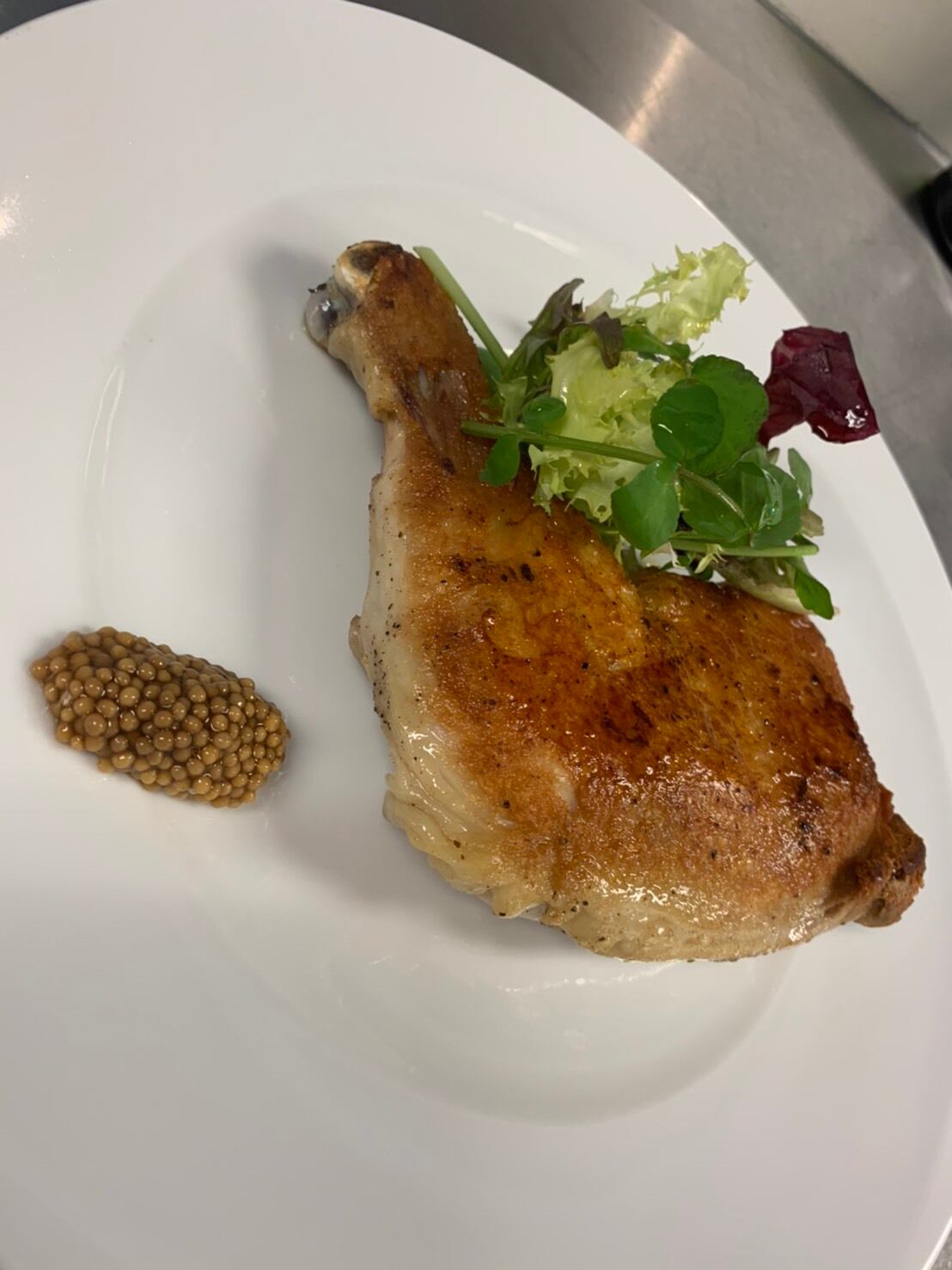 低温のオイルでじっくり火を入れるので皮目パリパリ、中はジューシーです。